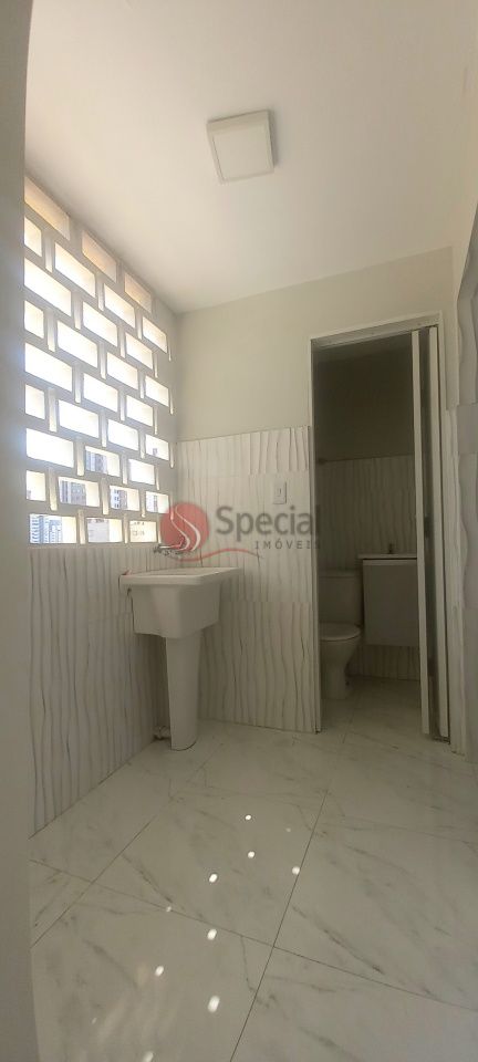 Banheiro social com box, gabinete e espelho