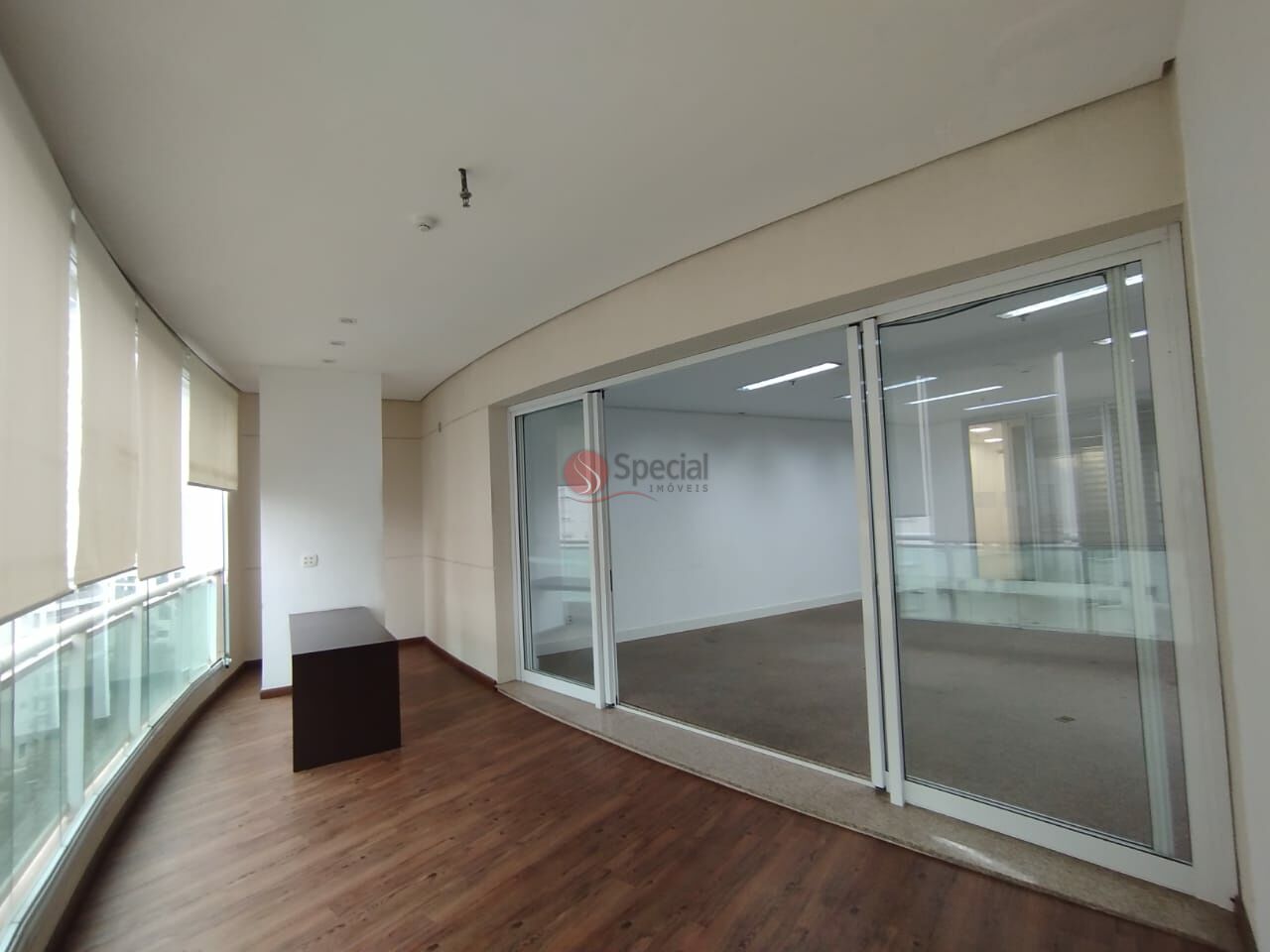O espaço conta com layout open space com varanda, 02 banheiros, carpete, ar-condicionado split, além de duas salas fechadas e depósito, oferecendo versatilidade para diferentes configurações de escritório.
